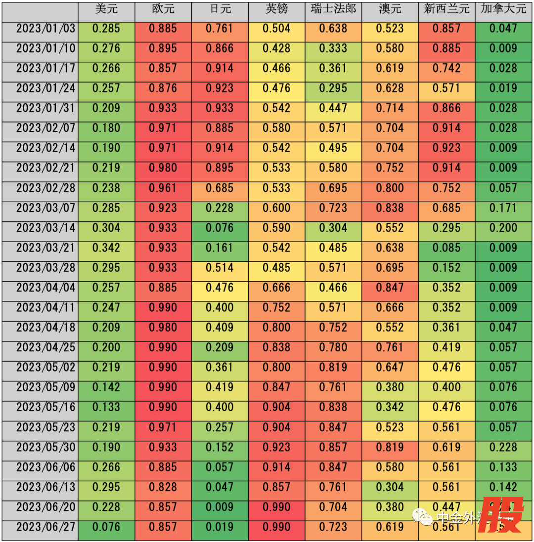 图表29:主要货币的净头寸/未平仓量的百分位数(为反转信号指标,其值过高或过低时易出现反转)
