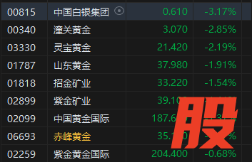黄金股继续回调,中国白银集团跌超3%。消息面上,国际贵金属持续下行,2月6日早,金银开盘延续下跌,现货黄金一度跌破4700美元关口,日内跌幅超1%;现货白银最低触及64.035美元/盎司,昨日收跌逾20%,回吐年初至今涨幅。昨晚公布的美国12月JOLTS职位空缺创五年多新低,远低于预期。美国挑战者企业1月裁员10.8万人,创2009年以来同期新高,环比激增205%。此外,美联储理事库克表示,美联储必须在近期将通胀率拉回目标水平,这对于维护其信誉至关重要。库克认为,目前风险偏向于通胀上行,同时经济前景不确定性仍处高位。