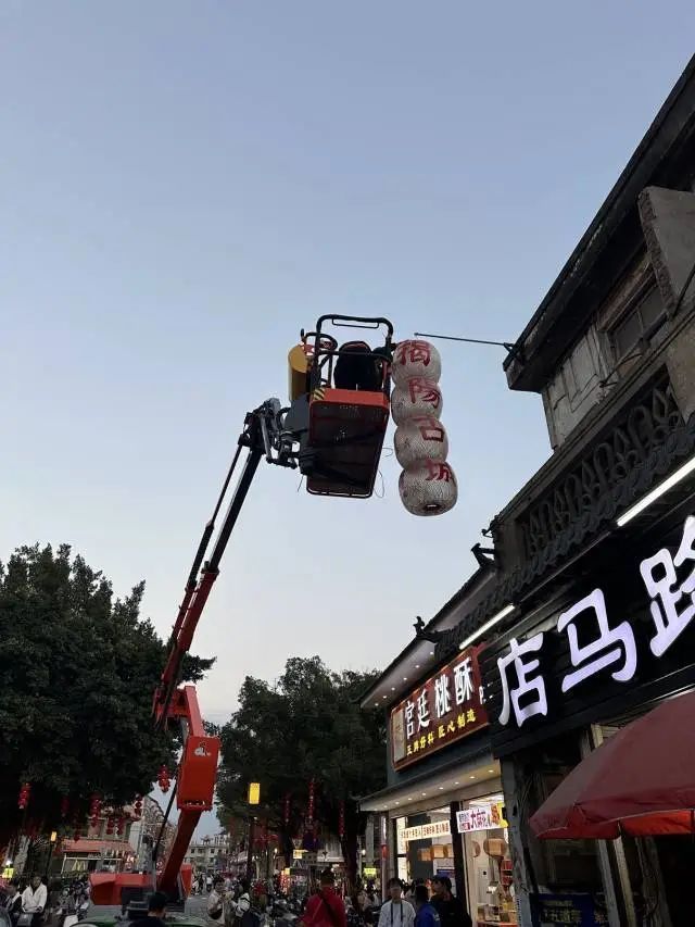 文化传承是古城保育活化的重要命题。如今,揭阳古城不少角落都留下了青年组实践的印迹。2024年春节前夕,中山街道计划在揭阳古城打造文化地标,原本打算像许多旅游城市一样绘上一面打卡墙或涂鸦墙。但林蒋新提出了另一种方案——他找到七年前走街串巷认识的梁奶奶,拜托她制作四个油纸灯笼。这位藏在古城深巷的七旬“守艺人”,在竹编灯笼上写字、上漆,用一周的时间就完成了四个灯笼的制作。腊月廿七,四个灯笼串成“揭阳古城”,挂在古城东入口的骑楼上,成为春节期间热门打卡点。